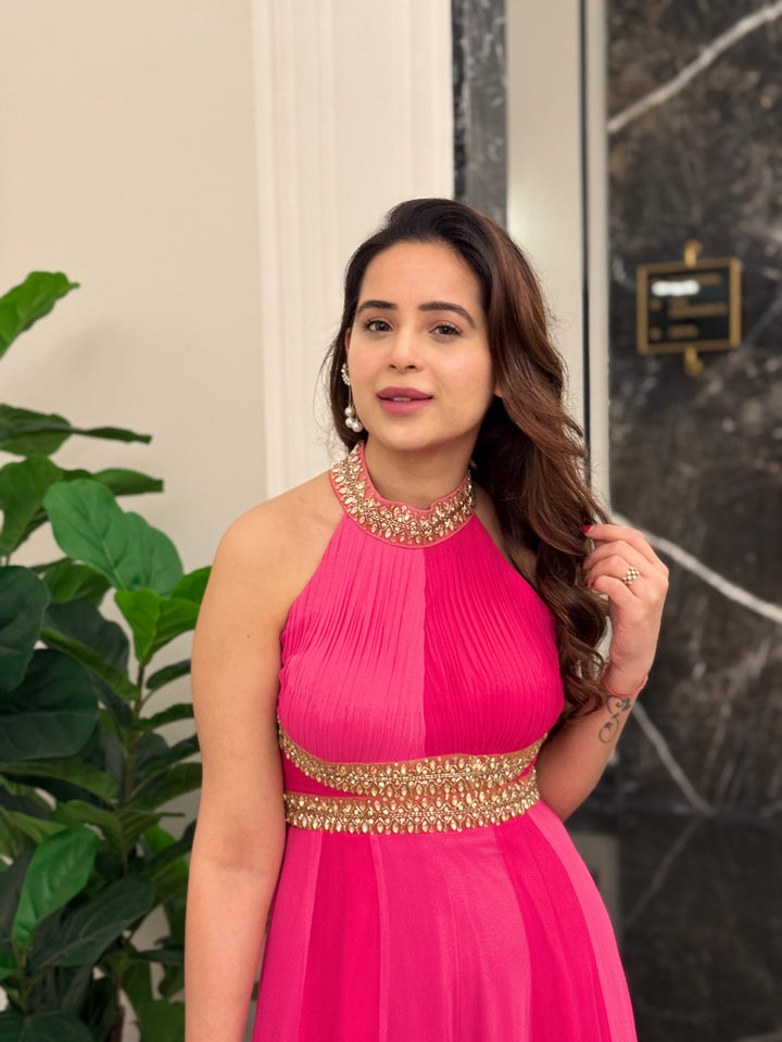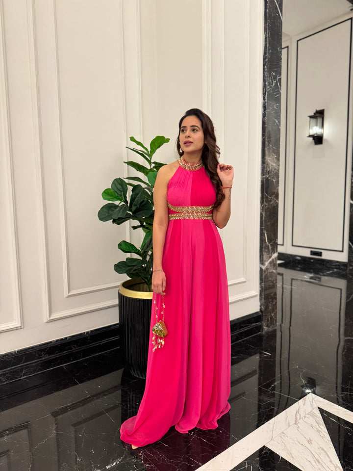 This halter jumpsuit is drama, elegance, and sparkle all in one. The kundan and mirror work adds that festive gold glow, while the open back keeps it fun and flirty.Think sangeet...