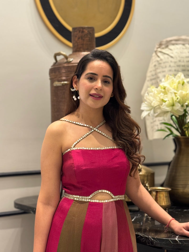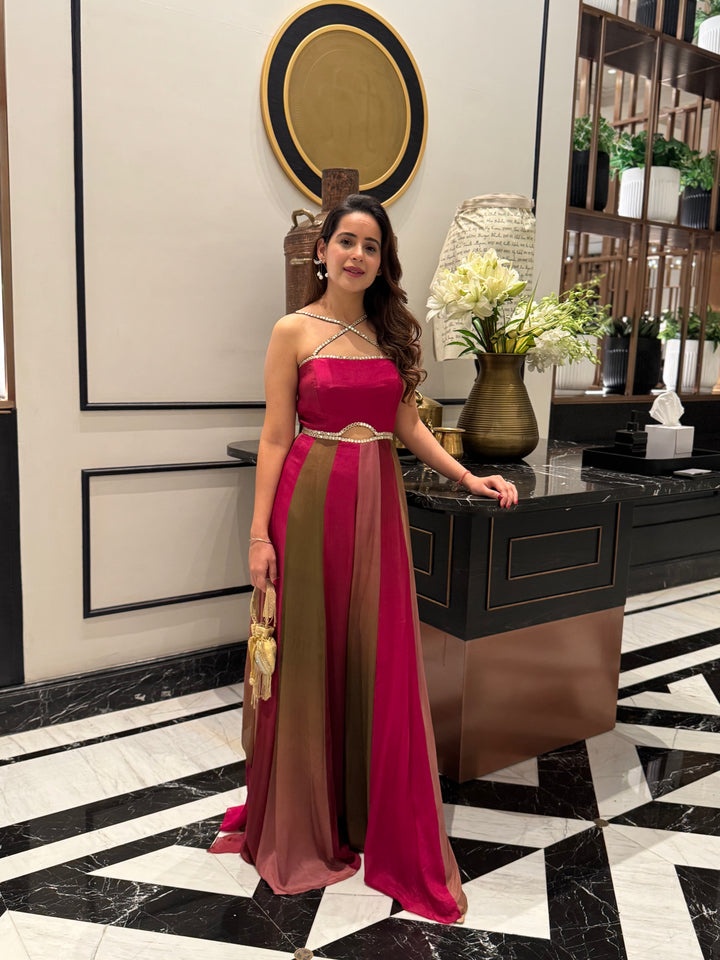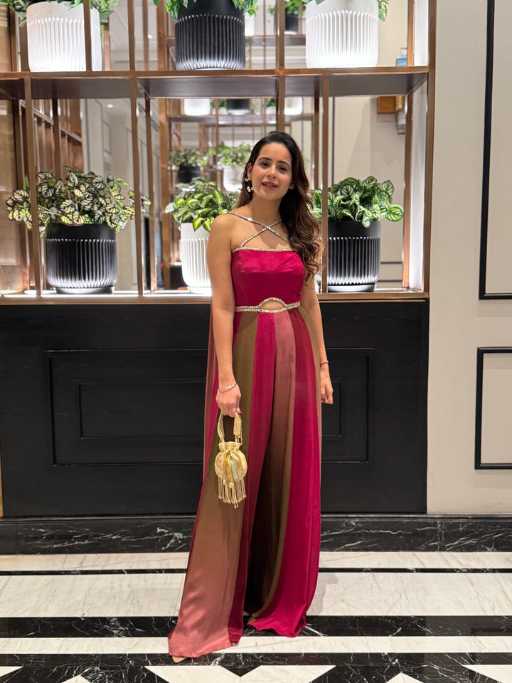 Aarza is a luxe ombre jumpsuit in rich berry and bronze, detailed with hand-embellished straps and a shimmer belt.Fluid, flattering, and made to turn heads.Fabric - Pure georgette
