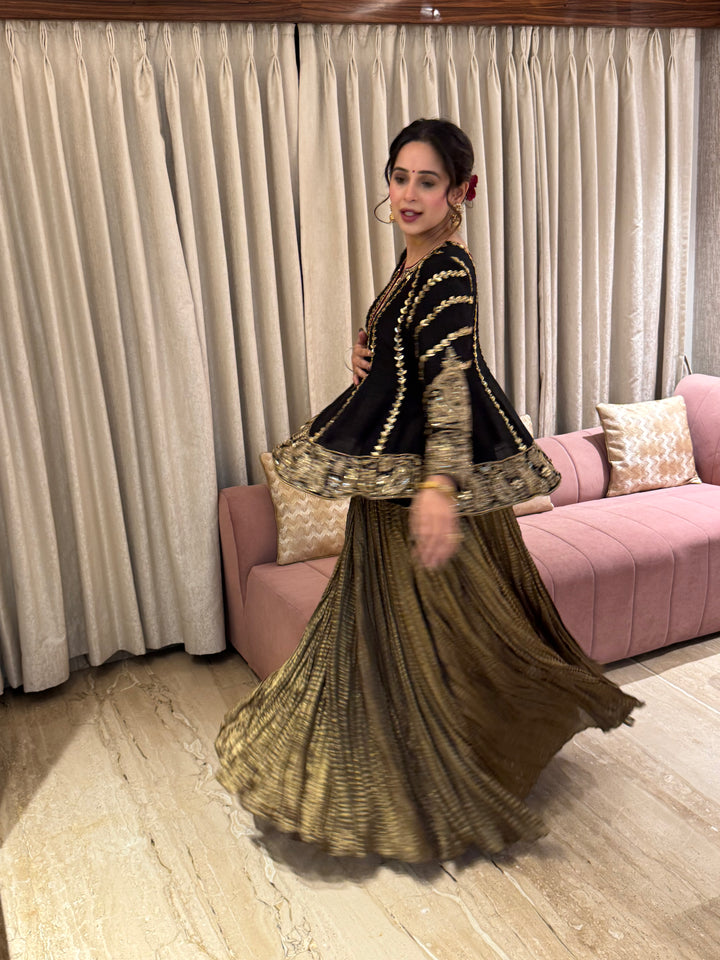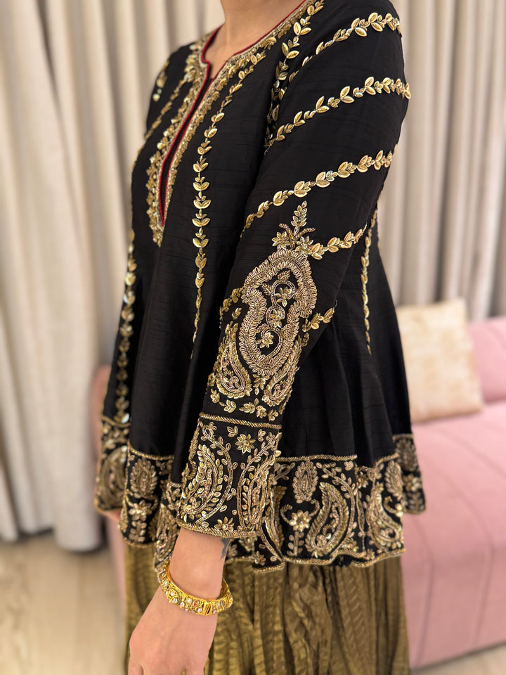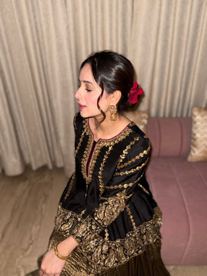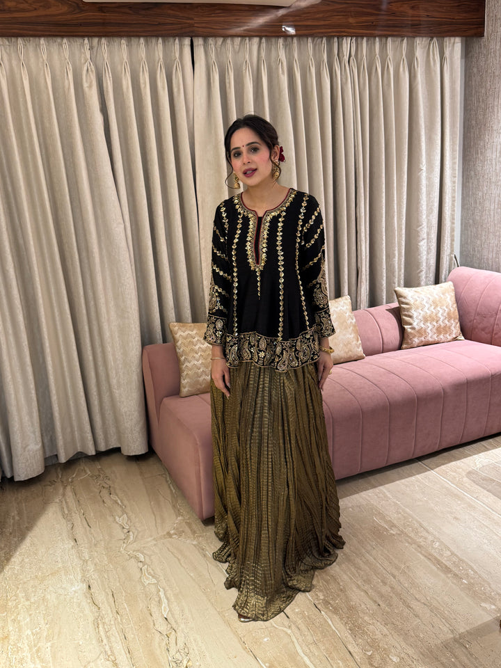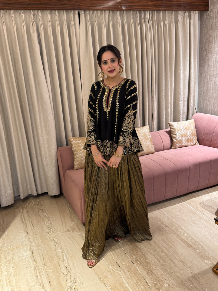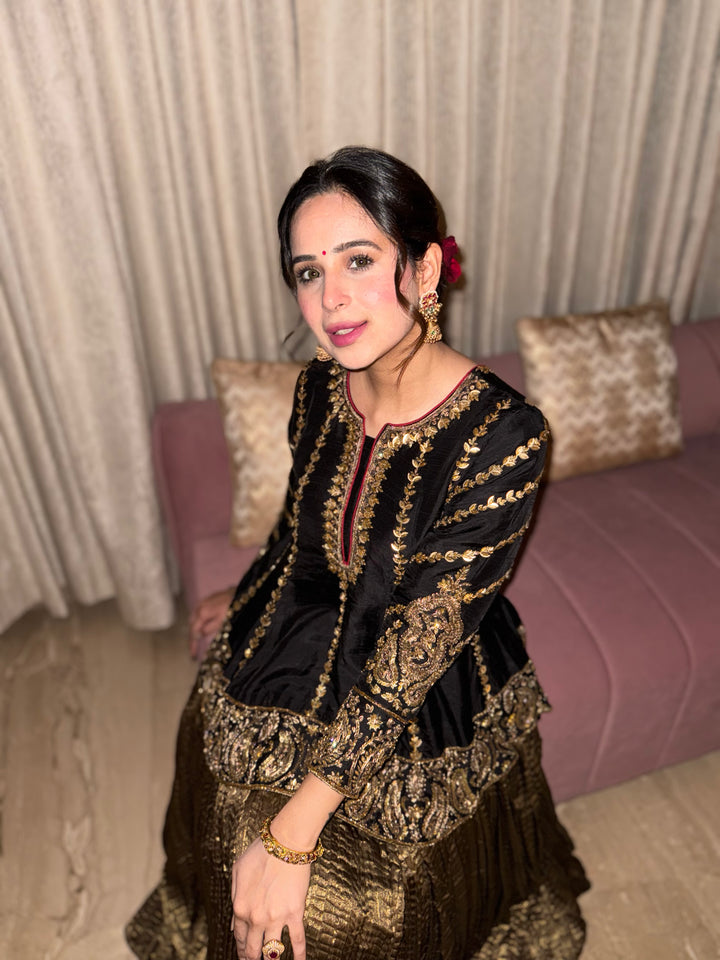 From hand-embroidered zardozi vines to antique metallic textures - this look celebrates old-world opulence with a modern silhouette. A TBW classic for evenings that call for quiet grandeur.Short peplum top paired...