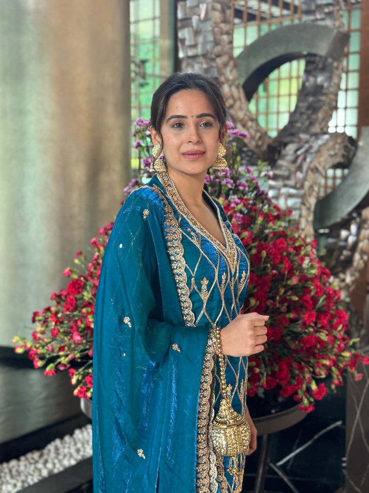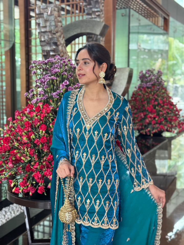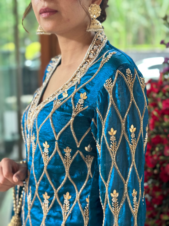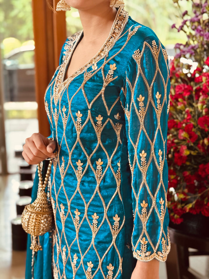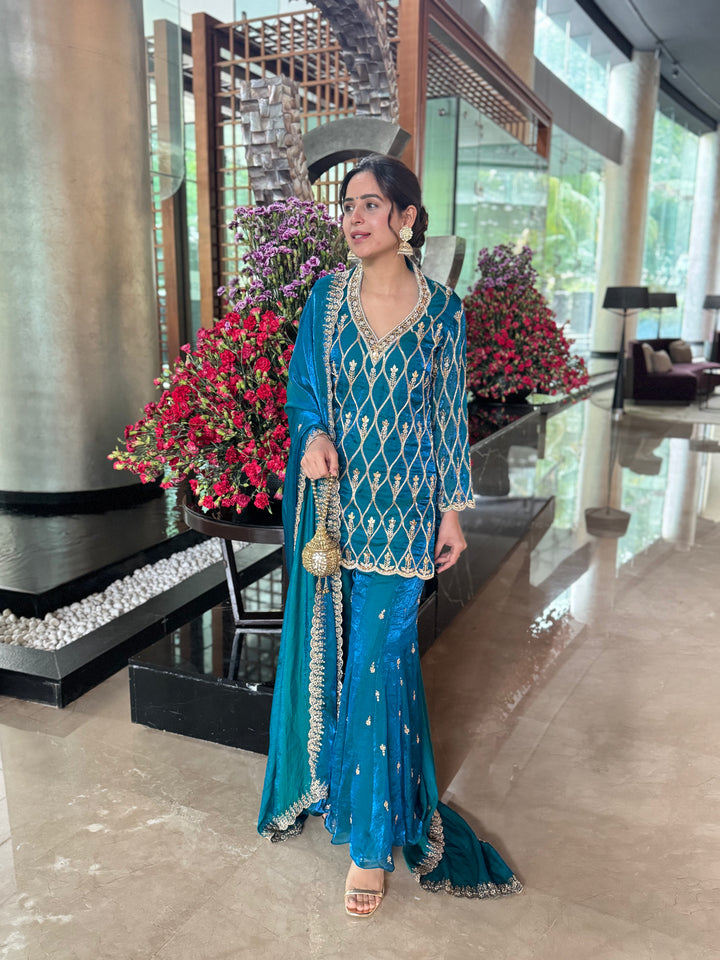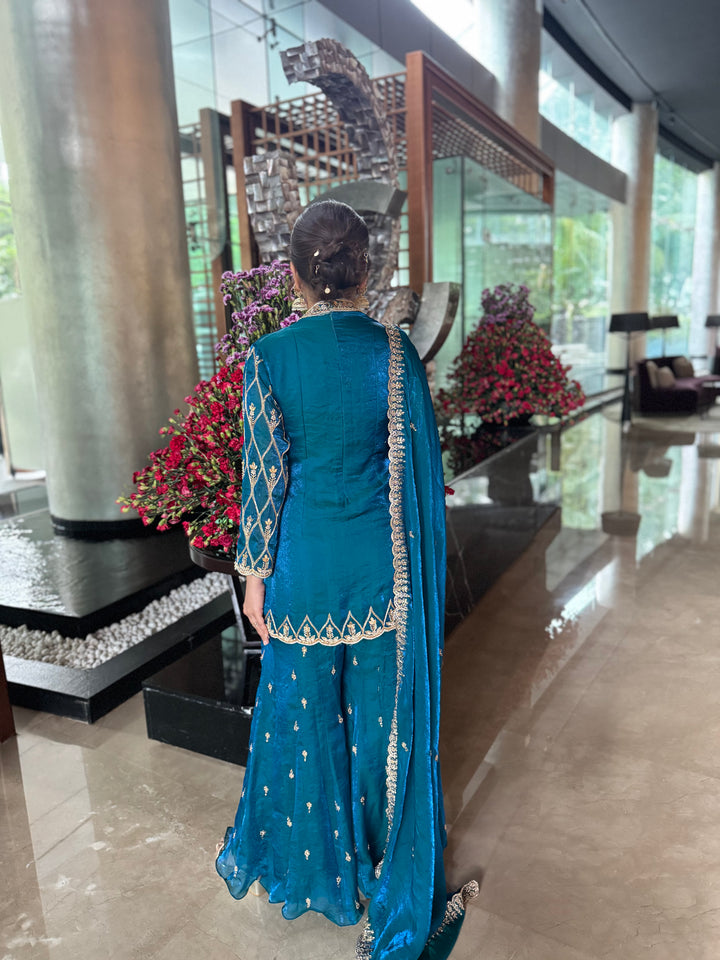 A teal blue sharara set crafted in pure fendi silk fabric with hand embroidery.
